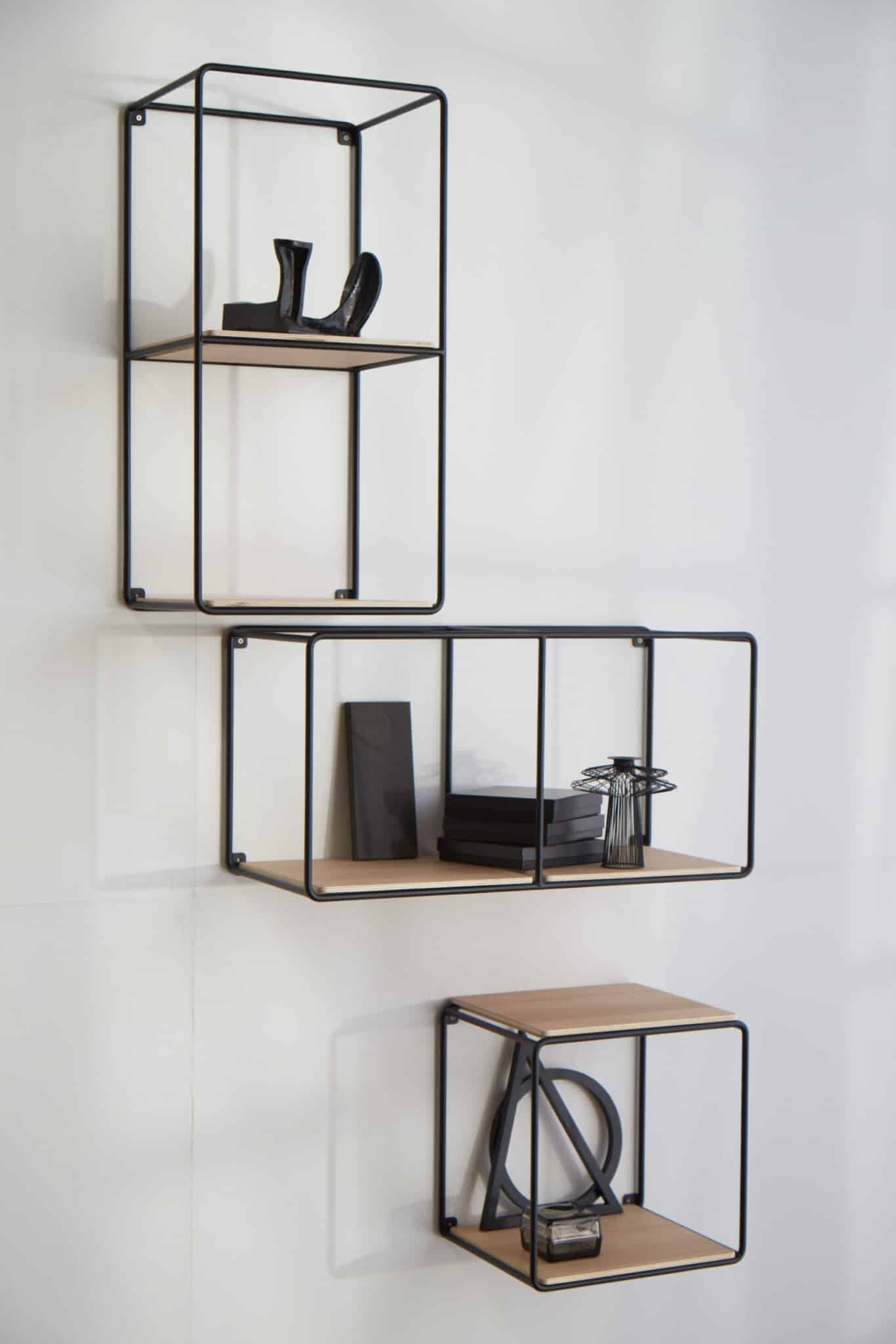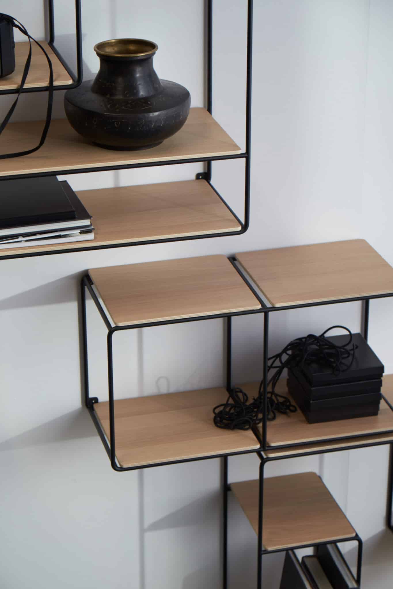 Anywhere reolerne er fremstillet af en pulverlakeret stålramme med hylder i egetræsfiner.