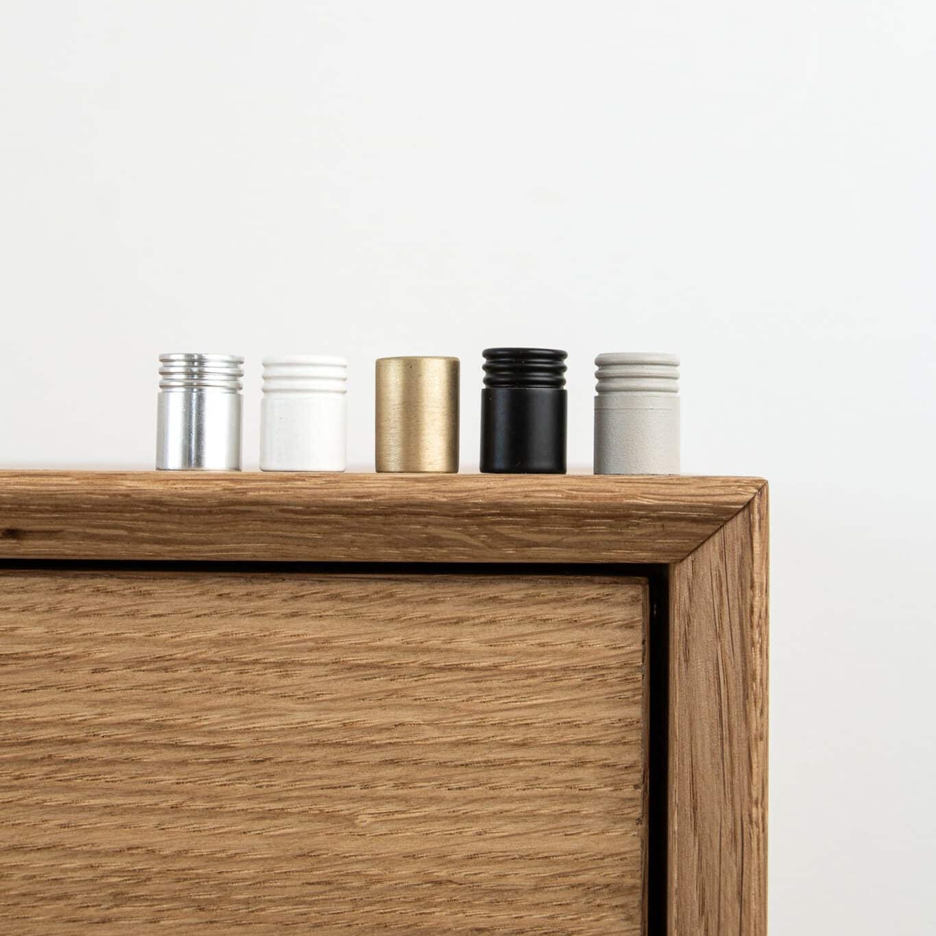 Knopfarve: Vælg mellem Alu, Hvid Olieret eg, Messing, Olieret eg