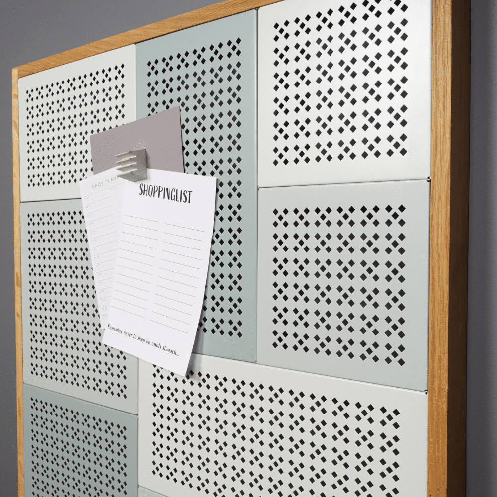MAG opslagstavlerne er fremstillet i mindre stykker perforeret stål, der samles til en helhed i en naturlig egetræsramme. I fremstillingsprocessen ligger et stort forarbejdningsarbejde, hvor hver enkelt del skal passes ind i helheden. Den funktionelleopslagstavle er perfekt til at hænge små sedler eller postkort på, men er samtidig en designmæssig oplevelse, som tilføjer noget ekstra til indretningen.
