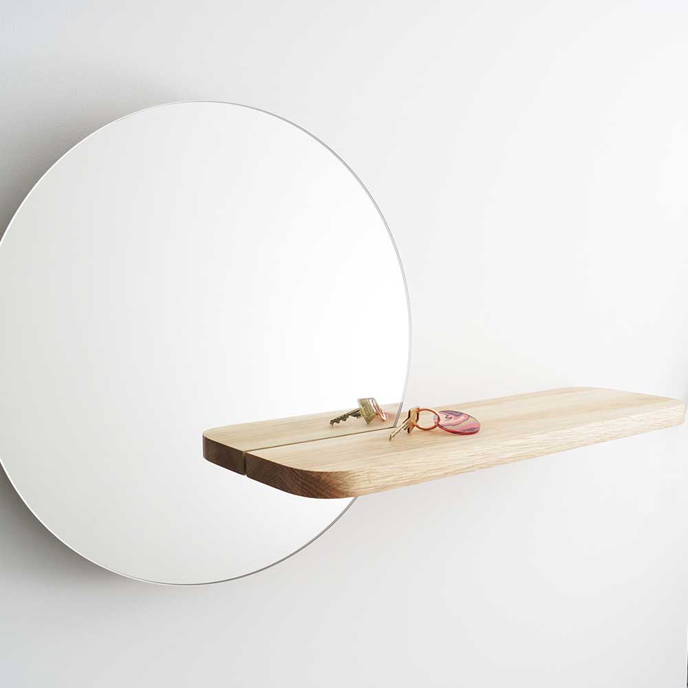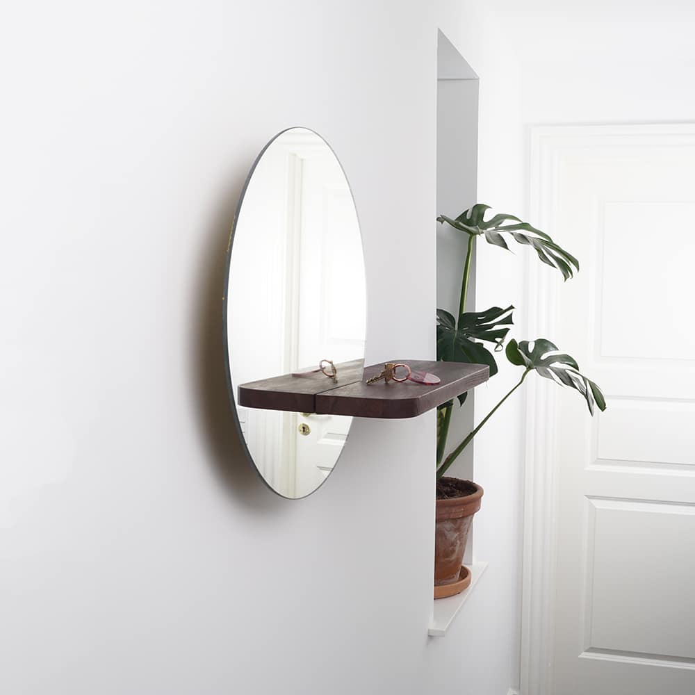 MOI spejlet er designet af Charlotte Høncke. Hun ønskede at udfordre den traditionelle placering af et spejl, og resultatet, af den kreative proces, blev MOI hylden, som er en smuk designløsning, der også er funktionel.