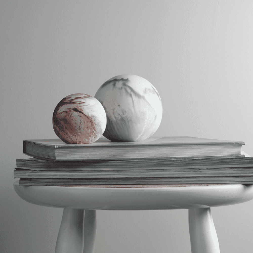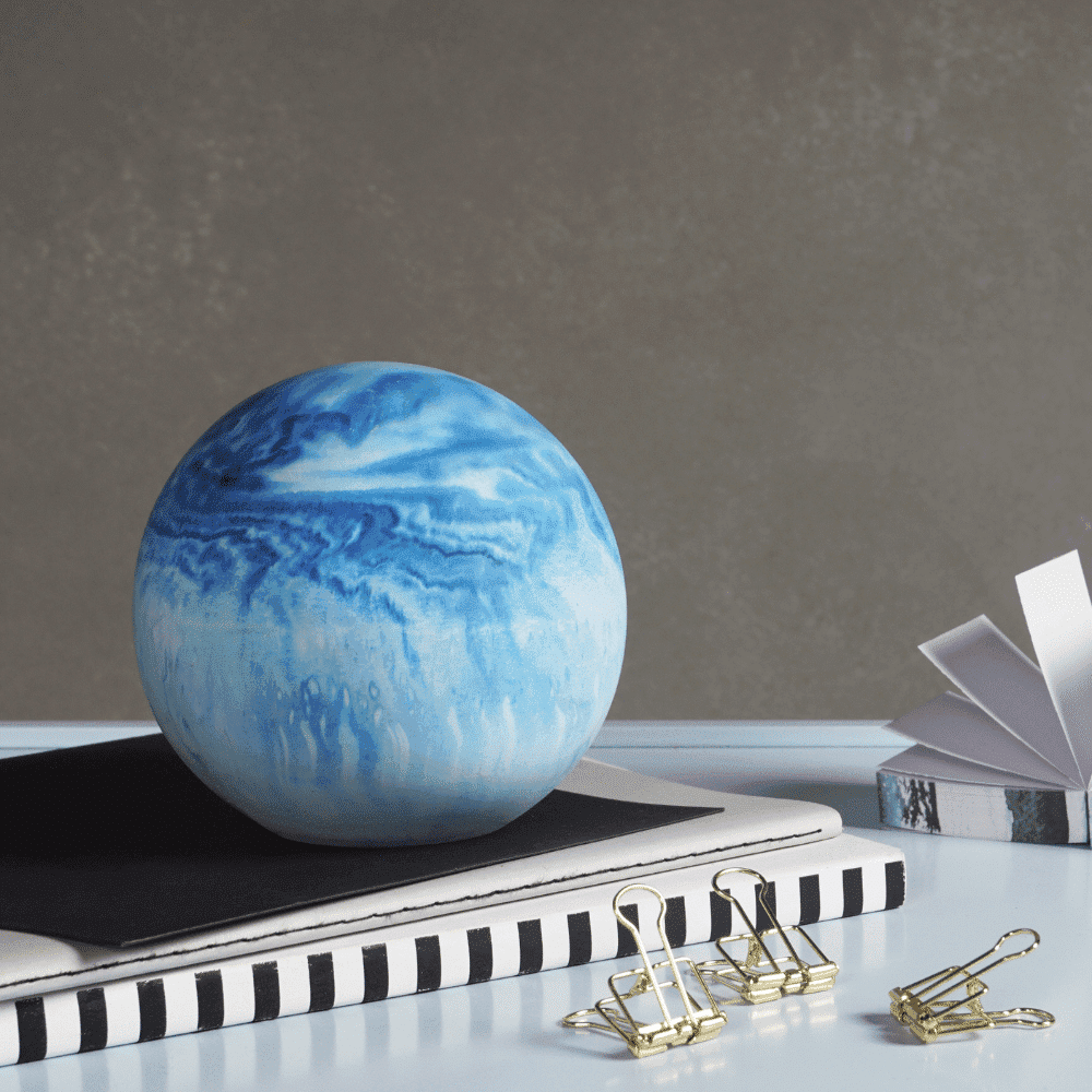 Planet Paperweights er håndlavede i en proces, hvor der eksperimenteres med forskellige farver gips, som mikses i en form for at opnå et unikt marmoreret og abstrakt udtryk. Der er derfor ikke to planeter, der er ens, og de fortæller hver især deres egen historie om, hvordan farverne i støbningen bevæger sig ind i og rundt om hinanden.
