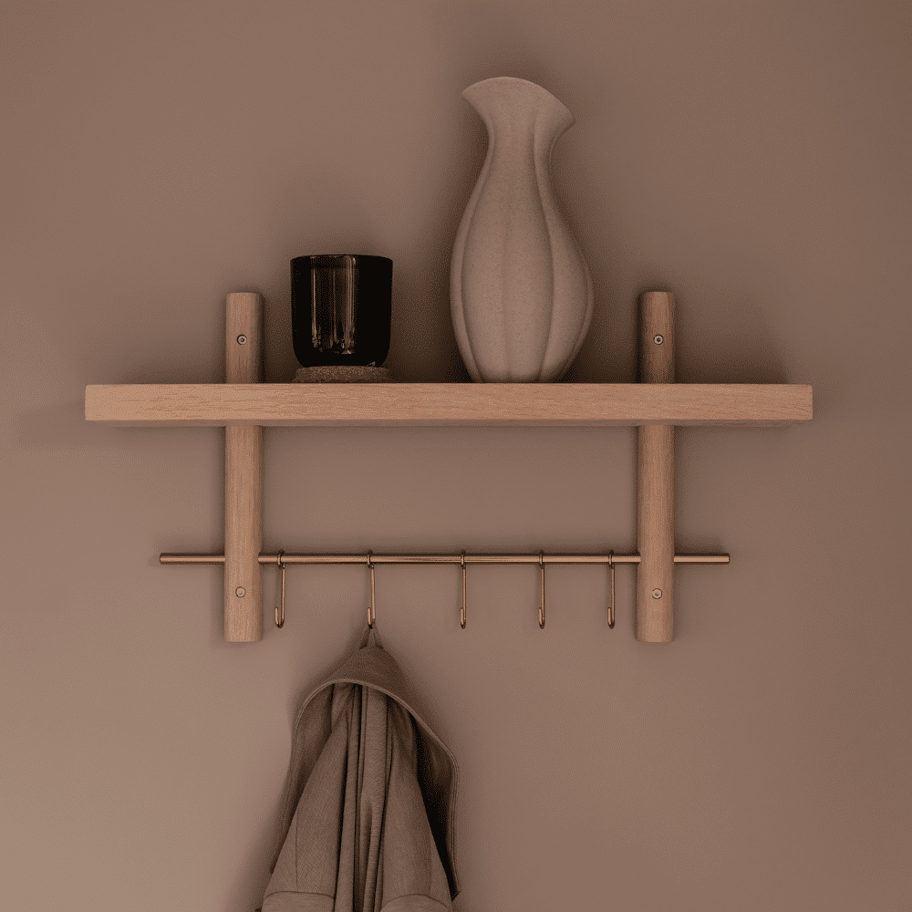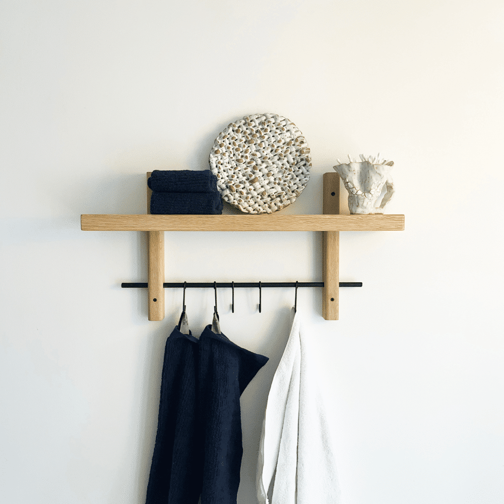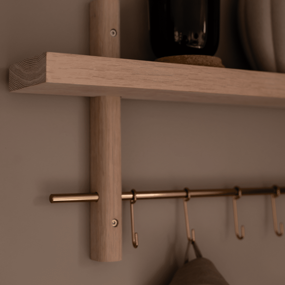 Vores Rus Knagerække gør din indretning både funktionel og stilfuld. Kombinationen af knager og hylde giver dig utallige anvendelsesmuligheder. I entreen kan den holde styr på jakker, nøgler og tasker. I køkkenet fungerer den perfekt til viskestykker, grydelapper og små opbevaringsglas. På badeværelset er den ideel til håndklæder, hudplejeprodukter og parfumer. Med denne løsning får du ekstra opbevaringsplads til de små ting, der gør hverdagen mere overskuelig. Med en kombination af naturligt egetræ og et moderne udtryk passer den perfekt ind i ethvert hjem.