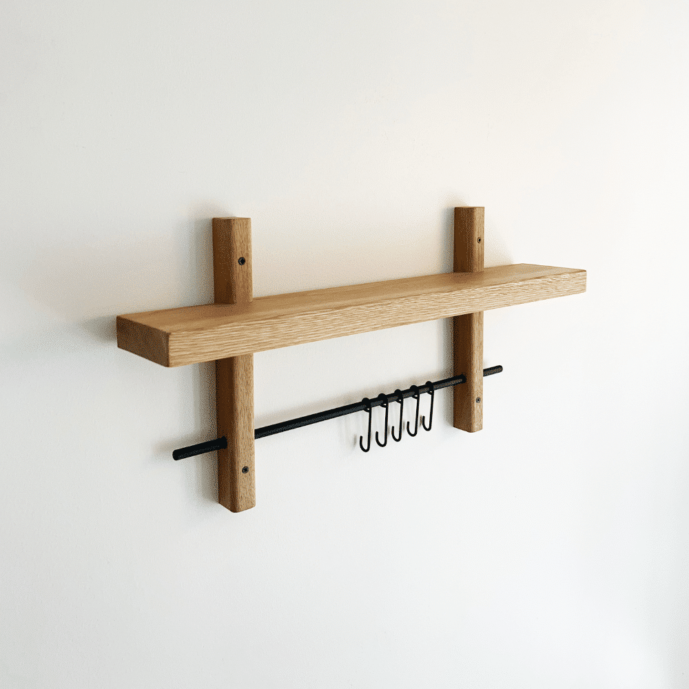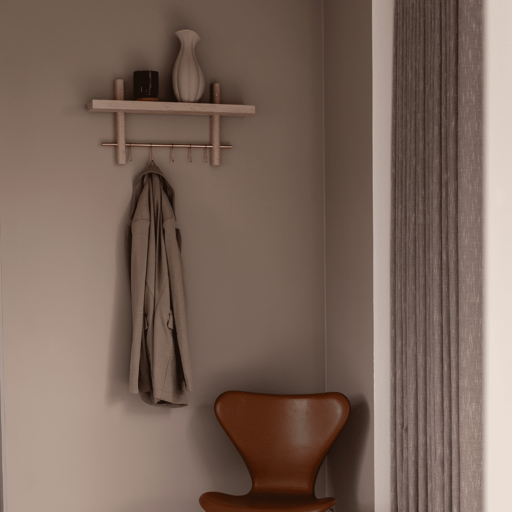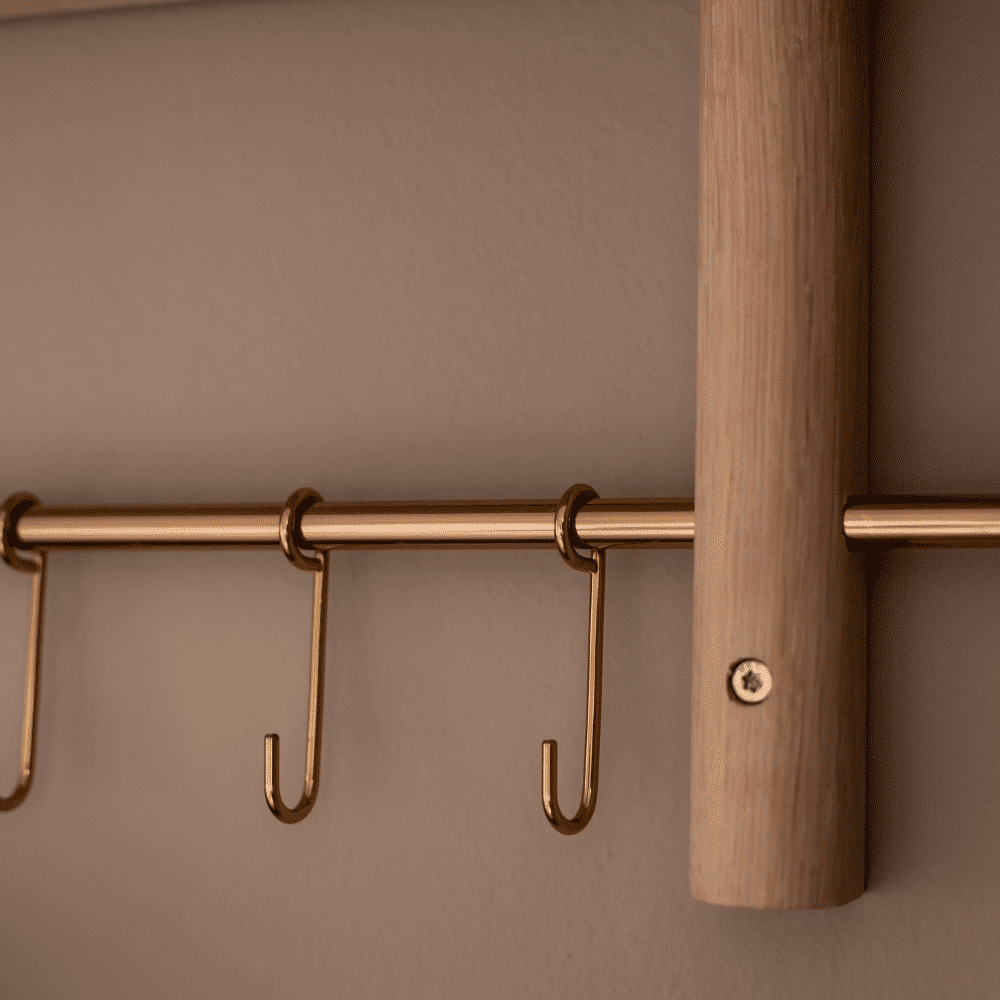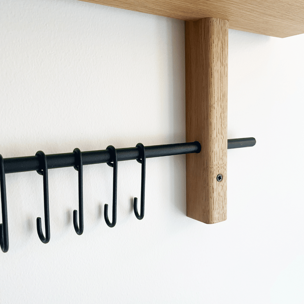 Vores Rus Knagerække gør din indretning både funktionel og stilfuld. Kombinationen af knager og hylde giver dig utallige anvendelsesmuligheder. I entreen kan den holde styr på jakker, nøgler og tasker. I køkkenet fungerer den perfekt til viskestykker, grydelapper og små opbevaringsglas. På badeværelset er den ideel til håndklæder, hudplejeprodukter og parfumer. Med denne løsning får du ekstra opbevaringsplads til de små ting, der gør hverdagen mere overskuelig. Med en kombination af naturligt egetræ og et moderne udtryk passer den perfekt ind i ethvert hjem.