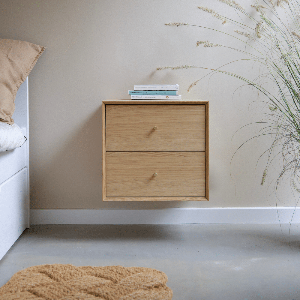 The Box 3739 med to skuffer er et væghængt sengebord, der tilbyder ekstra opbevaringsplads i en kompakt og elegant form. Med sine to separate skuffer giver det dig mulighed for at organisere dine ejendele, så du nemt kan holde styr på det, du bruger til hverdag og det, du gerne vil have tæt på om natten.